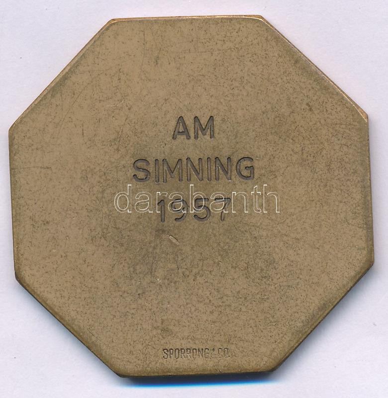 Sweden 1957. "Sveriges Akademiska Idrotts-förbund / Am Simning" one-sided bronze award medal with "SPORRONG&CO" maker's mark- and engraved text on the reverse. Sign.: "S. Kulle" (~46x46mm) C:AU