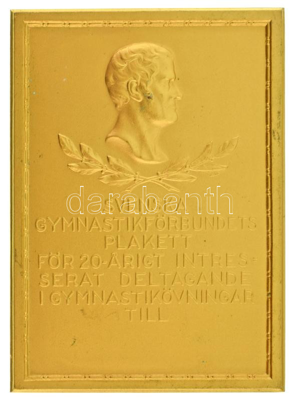 Svédország DN "A Svéd Torna Szövetség plakettje 20 éves aktÃv részvételért a torna gyakorlatokban" egyoldalas, aranyozott bronz emlékplakett, hátoldalán "SPORRONG" gyártói jelzéssel (53x74mm) T:AU