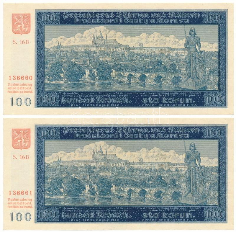 Description: Német Harmadik Birodalom / Cseh-Morva Protektorátus 1940. 100K (2x) sorszámkövetők, második kiadás, "S. 16 B 136660 - S. 16 B 136661" T:AU / German Third Reich / Protectorate of Bohemia and Moravia 1940. 100 Korun, consecutive serials, second issue "S. 16 B 136660 - S. 16 B 136661" C:AU