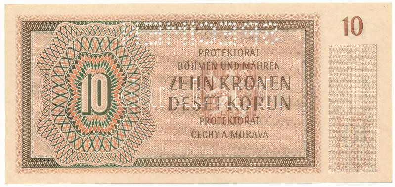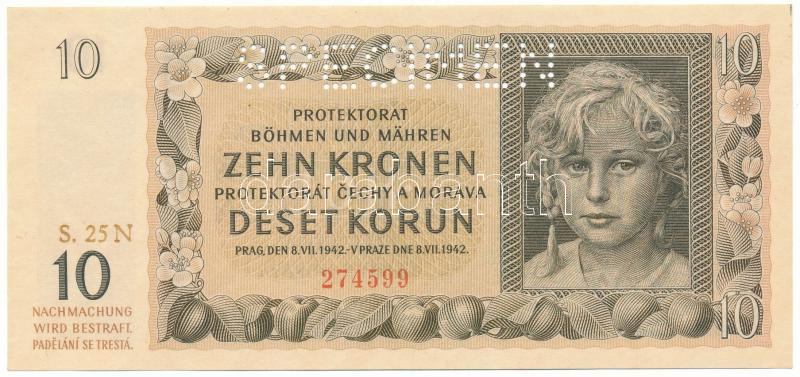 Description: Német Harmadik Birodalom / Cseh-Morva Protektorátus 1942. 10K "S. 25 N 274599", "SPECIMEN (MINTA)" perforációval T:AU German Third Reich / Protectorate of Bohemia and Moravia 1942. 10 Korun "S. 25 N 274599" with "SPECIMEN" perforation C:AU Krause 8.s
