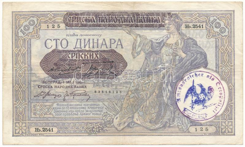 Szerbia 1941. Német megszállás 100D felülbélyegzett ideiglenes kiadás,... https://www.darabanth.com/en/514-Auction-philately-postcards-numismatics-artwork-books-colletibles-jewelry/515.0/Numismatics/Worldwide-banknotes~1316/Szerbia-1941-Nemet-megszallas-100D-felulbelyegzett-ideiglenes-kiadas-hamis-naci-felulbely~II3419449