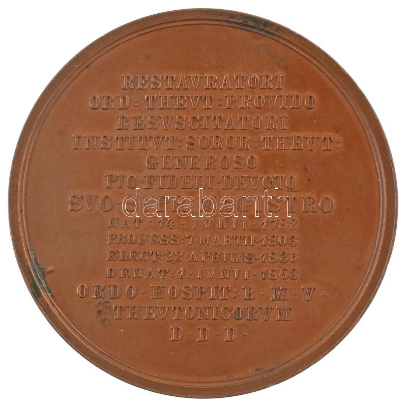 Austria 1863. "MAXIMILIANVS JOS ARCH AVST ORD THEVT SVPR MAG / RETAVRATORI ORD THEVT PROVIDO RESVSCITATORI INSTITVT SOROR THEVT GENEROSO PIO FIDELI DEVOTO SVO SVPR MAGISTRO NAT: 14 IVLII 1782 PROFESS:7 MARTII 1803 ELECT:22 APRILIS 1835 DENAT:1 IVNII 1863 ORDO HOSPIT: B M V THEVTONICORVM D D D" bronze, double-sided, struck medal Sign.: C. Radnitzky (57mm) C:AU patina