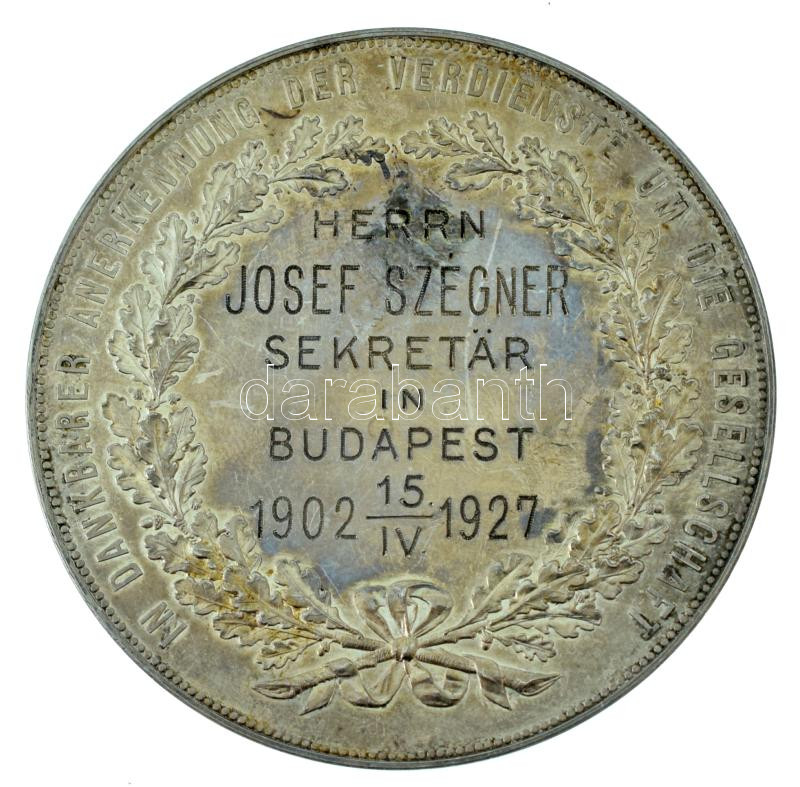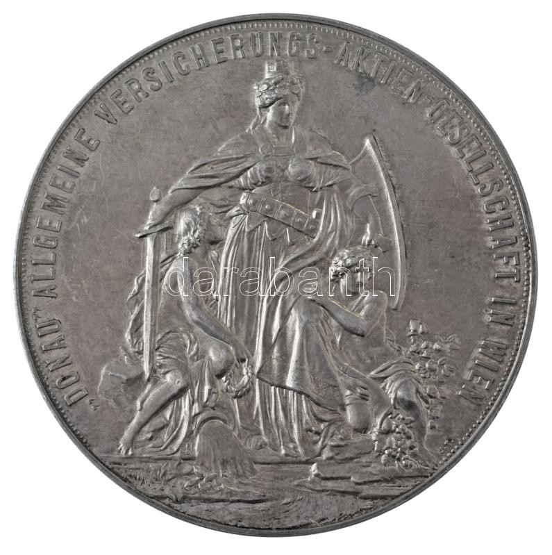 Ausztria 1927. "Donau Allgemeine Versicherungs-Aktien-Gesellschaft in Wien / In Dankbarer Anerkennung der Verdienste um die Gesellschaft (Duna Általános Biztosító Társaság Bécsben / A cégnek nyújtott szolgáltatások hálás elismeréseként)" peremén jelzett Ag érdemérem névre szóló gravírozással. Szign.: JT (70,05g/0.900/62mm) T:AU patina