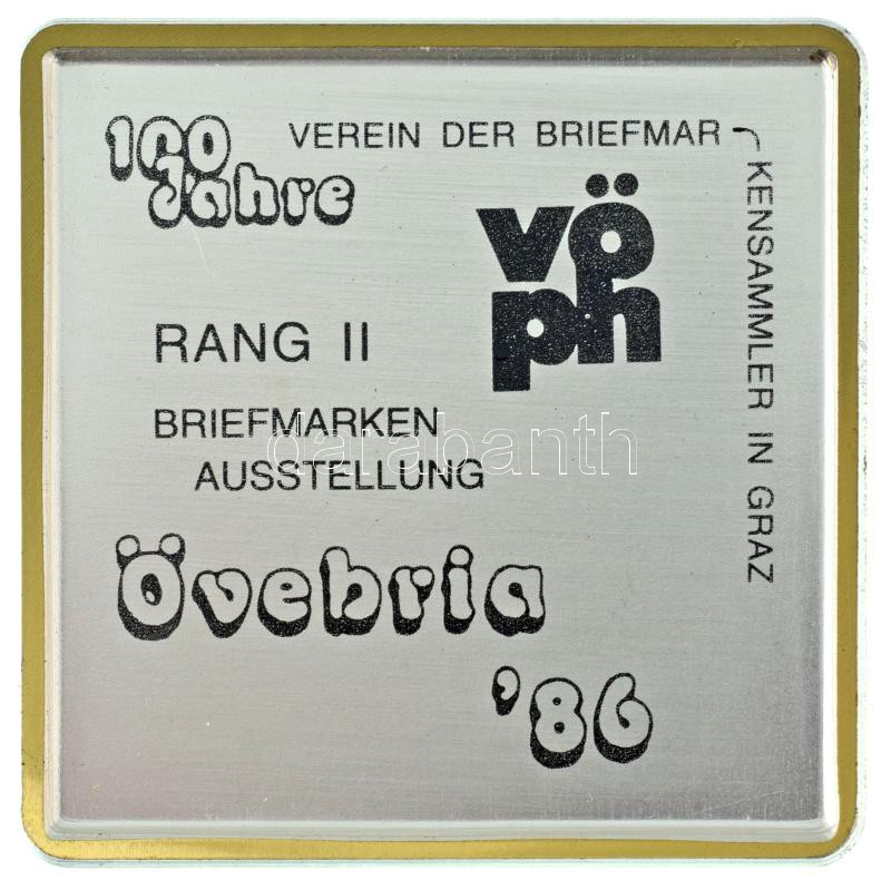 Austria 1986. "Vöph (Verband Österreichischer Philatelistenvereine) - 100 Jahre - Verein der Briefmar, Kensammler in Graz - Rang II - Briefmarken Ausstellung - Övebria '86" one-sided, metal commemorative plaque, gilt at the edge (59x59mm) C:AU