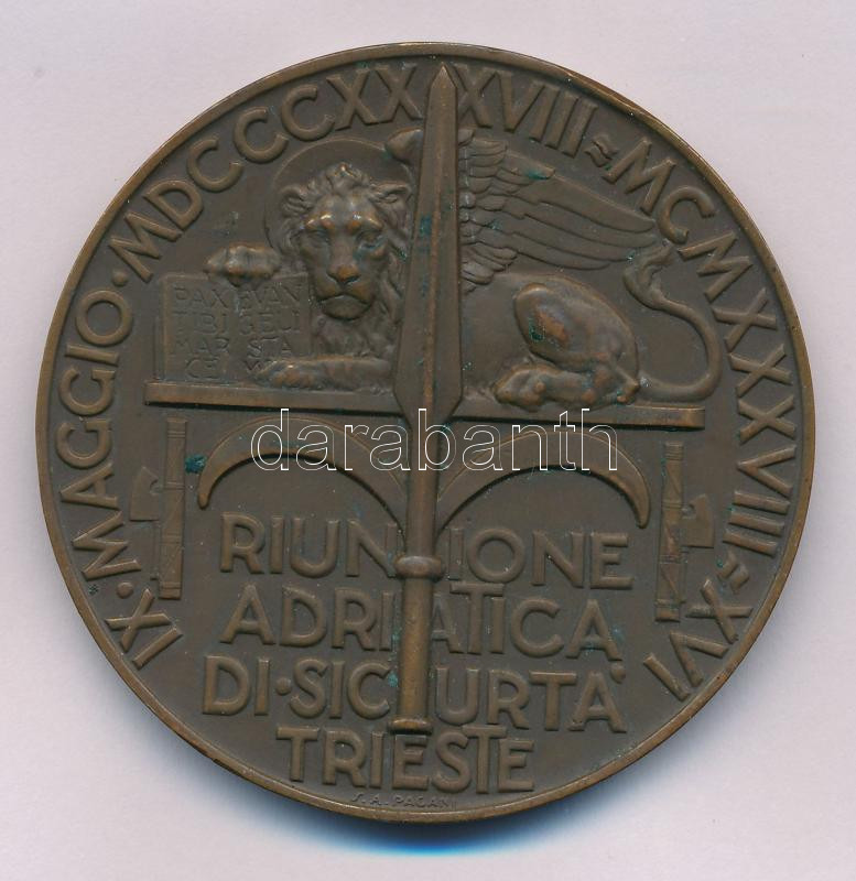 Olaszország 1938. "AVXILIVM IN ADVERSIS / IX MAGGIO MDCCCXXXVIII-MCMXXXVIII - RIUNIONE ADRIATICA DI SICURTA TRIESTE" kétoldalas bronz emlékérem az Adriai Biztosító Társulat 100 éves jubileumára. Szign.: Mistruzzi / Pagani (57mm) T:AU