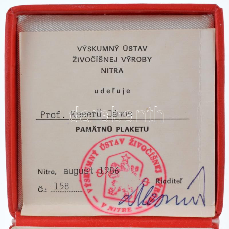 Szlovákia 1996. "Nitra Research Institute of Animal Production / Nitra Vyskumny Ustav Zivocisnej Vyroby (Nyitrai Állattenyésztő Kutató Intézet)" bronz emlékérem eredeti tokban, névre adományozói irattal (50mm) T:AU