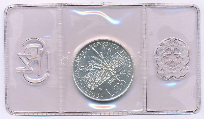 Olaszország 1988R 500L Ag "Alkotmány" eredeti lezárt fóliacsomagolásban és műanyag dísztokban, tanúsítvánnyal T:UNC