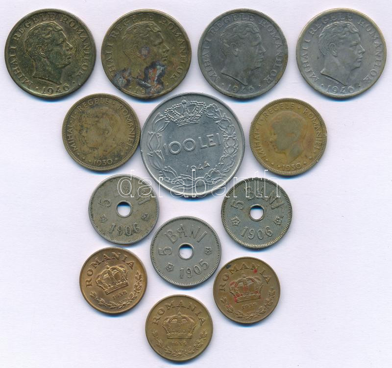 Románia 1905-1906. 5b Cu-Ni (3xklf) + 1930KN 5L Ni-sárgaréz "I. Mihály" + 1938. 1L Ni-sárgaréz (3db) + 1941. 100L Fe "I. Mihály" + 1946. 2000L Ni-sárgaréz "I. Mihály" (4db) T:XF-F