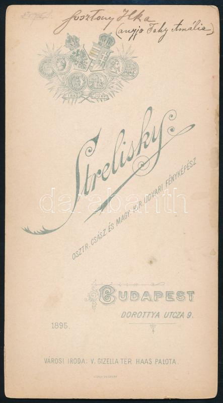 Description: 1895 gosztonyi és kövesszarvi Gosztony Ilona Borbála Amália Eleonóra (1869-1944) portréja, kabinetfotó Strelisky Lipót (1816-1905) cs. és kir. udvari fényképész budapesti műterméből, felületén kis elszíneződéssel, 20,5x11 cm