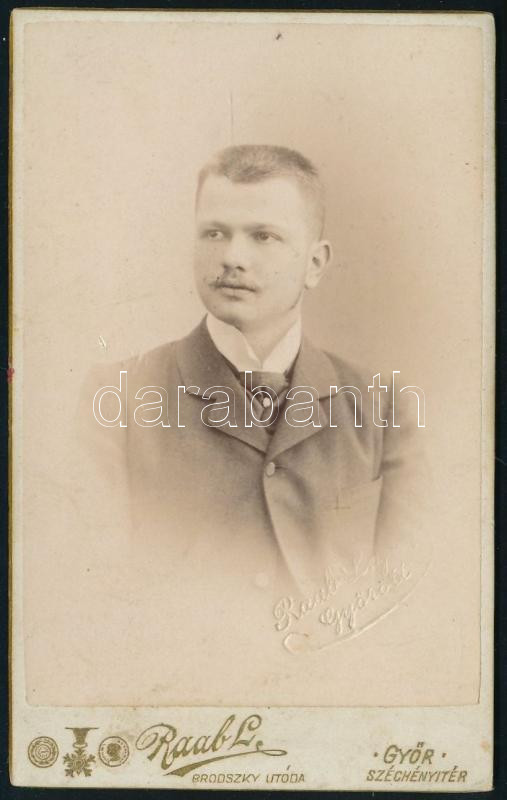1899 Mike Lajos ügyvédjelölt portréja, a hátoldalon dedikációval, vizitkártya Raab Lajos győri műterméből, 10,5x6,5 cm