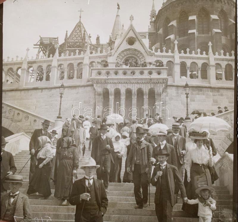 1905 Budapest, látványos üveg diák gyűjteménye: A Halászbástya a megnyitás után, Vár,, látkép a Várból, Mátyás templom. az új Országház, emberekkel, tömebbel , össz 18 db Ritka, látványos felvételek! 9x9 cm