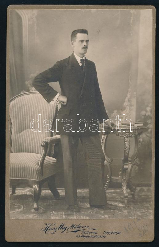 1916 Férfiportré, keményhátú kabinetfotó Huszthy Mátyás (Nagybánya/Hajdúszoboszló) műterméből, hátoldalon a műterem képével, 10,5x17 cm