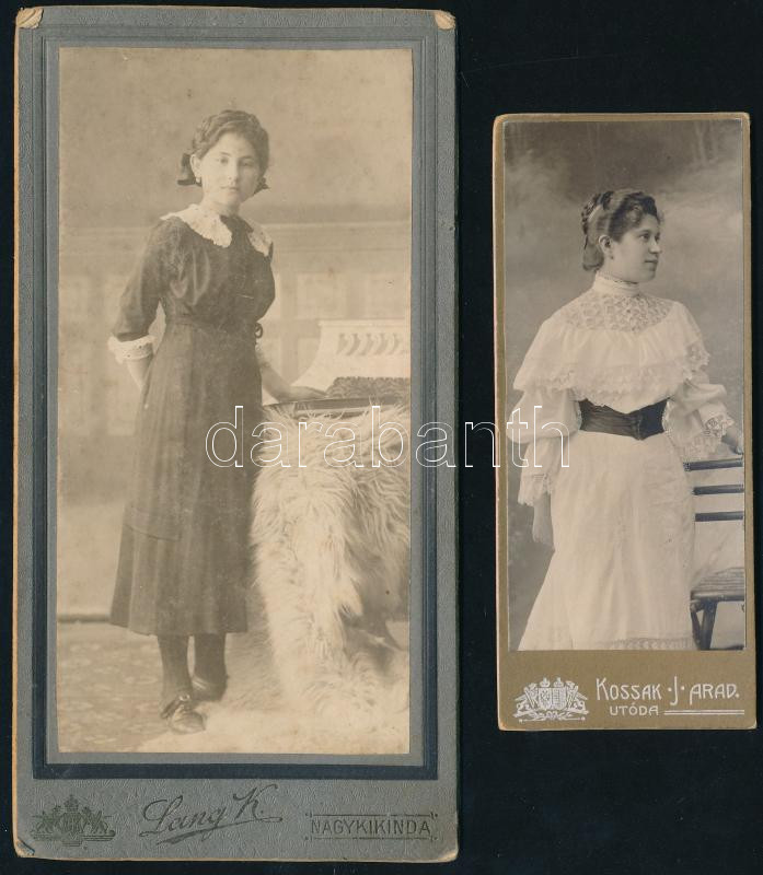Description: 2 db keményhátú fotó: Fiatal hölgy egészalakos portréja, Lang Károly nagykikindai műterméből, sarkain kissé sérült, 16,5x8,5 cm + Fiatal hölgy elegáns ruhában, Kossak József utóda aradi műterméből, 12x5 cm