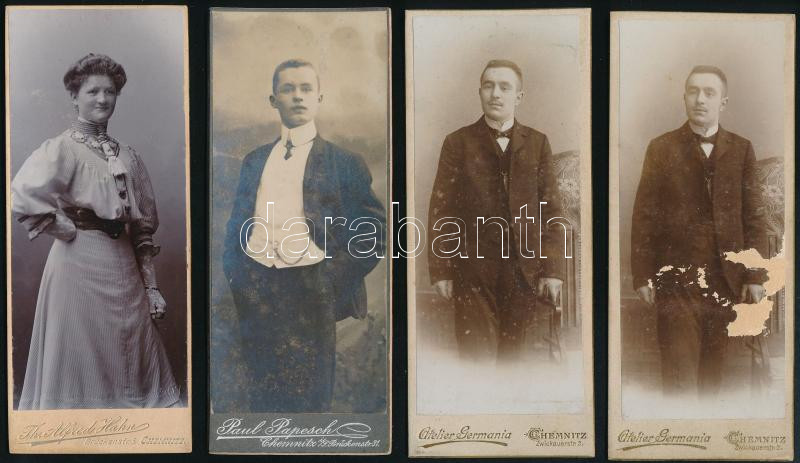4 db érdekes formátumú keményhátú fotó, chemnitzi műtermekből (Atelier Germania, Paul Papesch, Th. Alfred Hahn), 12x5 cm