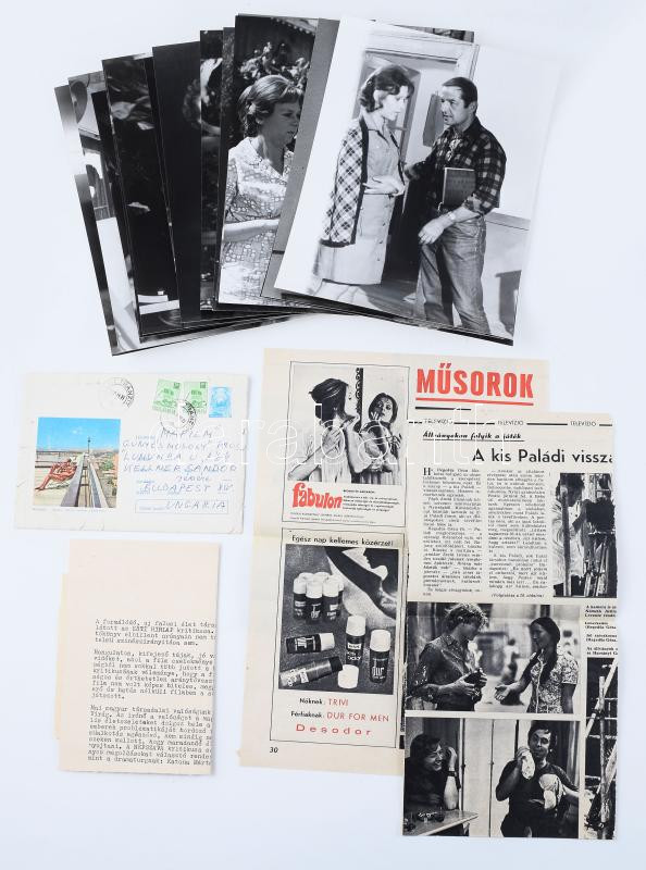 Description: Nemere László: Gúnyos mosoly c. filmjéről készült 15 db eredeti, jelzett filmfotó Domonkos László és Csabafi Attila felvételei 24x16 cm + kapcsolódó újságcíkk és levelezés