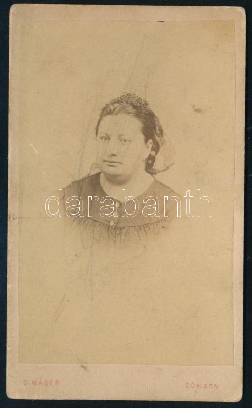 cca 1865 Nevesített női portré. Keményhátú vizitkártya fotó Mager Ottó komáromi műterméből, 10,5x6,5 cm