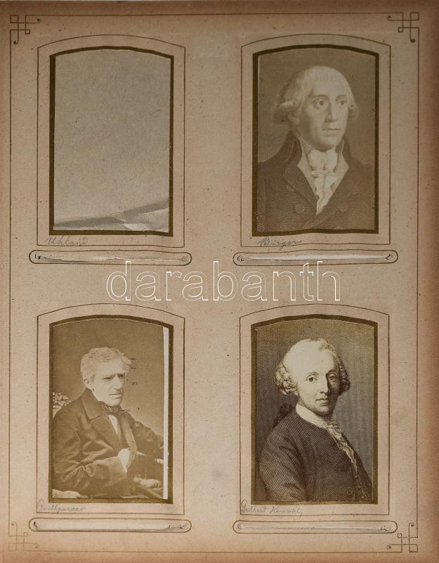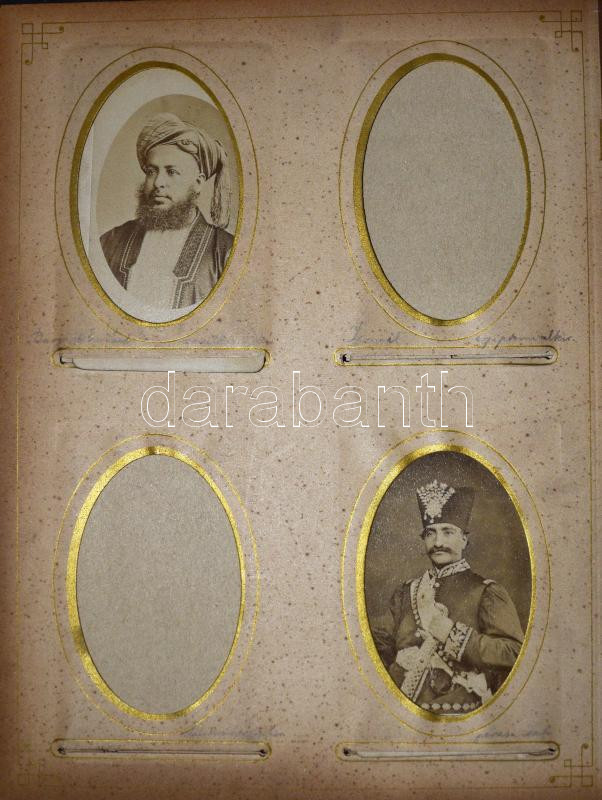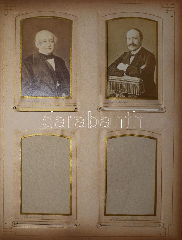 cca 1870-1880 Régi, dekoratív bőrkötésű fotóalbum, benne összesen 25 db keményhátú fotóval (vizitkártyák), mind neves személyeket ábrázolnak: uralkodók, politikusok, tábornokok, írók, költők, filozófusok, stb. (köztük több grafikák után készült fényképpel); az album sérült, hiányzó gerinccel, szétvált borítóval, 27x21,5x5,5 cm