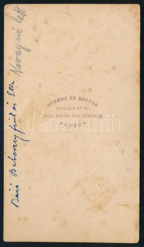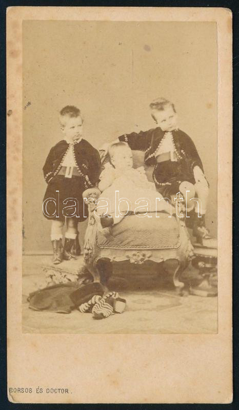 Description: cca 1875 báró Babarczy Kálmán (1842-1879) és gróf Forgách Matild (1853-1882) gyermekei: báró Babarczy Antal, Géza és Gabriella; vizitkártya Borsos és Doctor pesti műterméből, a hátoldalon feliratozva, kissé foltos, 10,5x6 cm