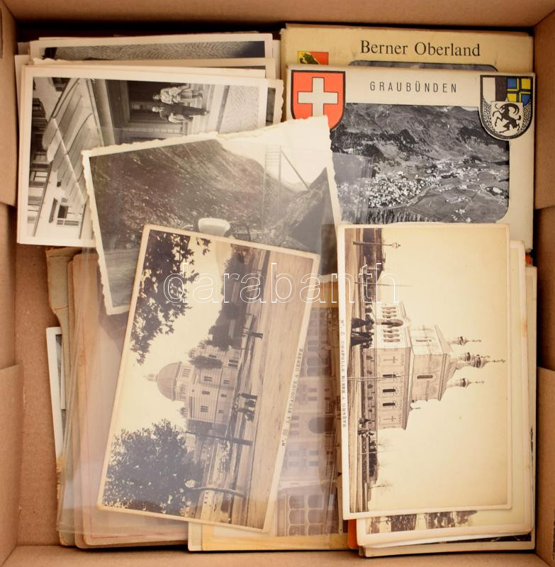 Description: cca 1880-1930 Svájc, vegyes fotó tétel: keményhátú fotók, táj- és városképek, épületek (közte a genfi zsinagóga), automobilos képek, mini albumok, stb.; egy kisebb doboznyi, változó méretben és állapotban