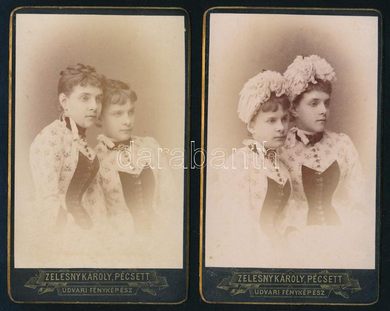cca 1885 Fiatal lányok portréja, 2 db keményhátú fotó Zelesny Károly pécsi műterméből, 10,5×6,5 cm