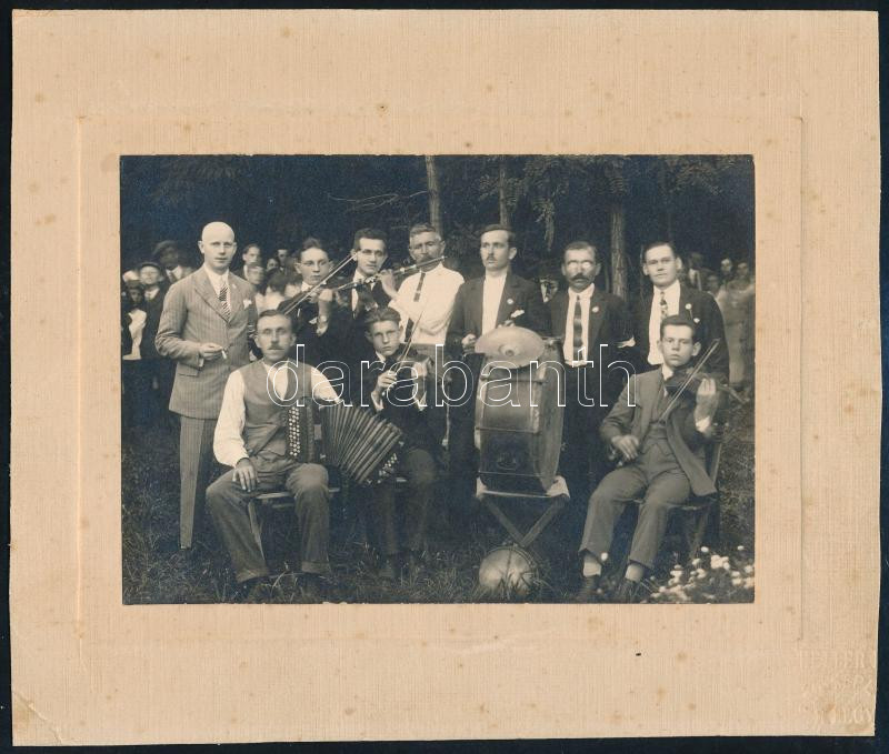 cca 1920 Férfizenészek és társaság, kartonra ragasztott fotó Heller M....