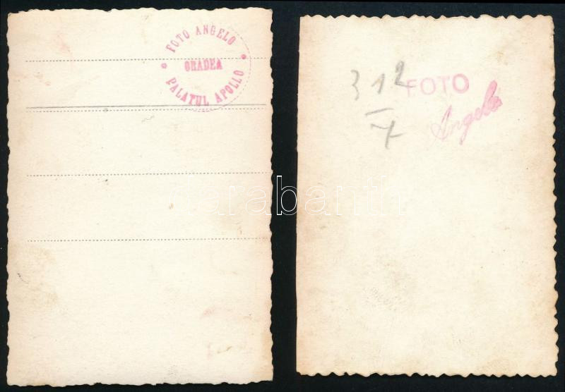 Description: cca 1930-1940 Nagyvárad (Oradea), utcai életképek (sétáló hölgy és munkások teherautóval), 2 db pecséttel jelzett fotó Angelo nagyváradi műterméből, 8,5x6 cm
