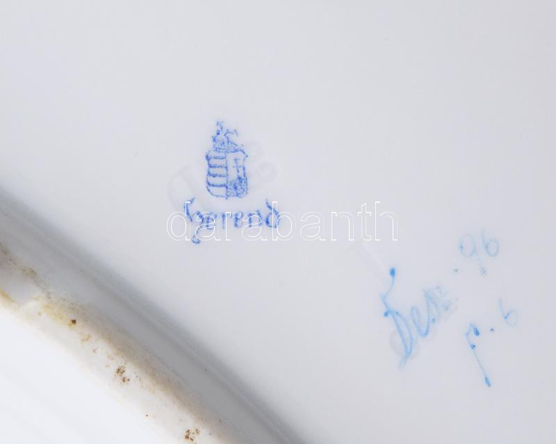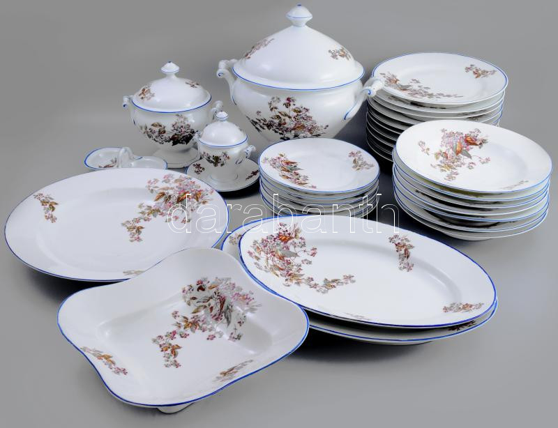 1896, Herendi jelzésű 31 darabos étkészlet. Kék peremezésű, virágcsokor mintákkal festett. Leveskínáló, kerek kínálótál, négyoldalú kínálótál, 2 darab ovális pecsenyés tál, 2 darab fedeles szószos edény, 10 darab nagytányér, 7 darab mélytányér, 6 darab süteményes tányér. Jelzett, kopással, 4-5 darabon sérüléssel. /// 1896, Herend marked 31-piece dining set. Painted with a blue rim and floral bouquet patterns. Includes a soup serving bowl, a round serving dish, a square serving dish, 2 oval meat platters, 2 covered sauce pots, 10 large plates, 7 deep plates, and 6 dessert plates. Signed, with wear, and 4-5 pieces with damage. NEM POSTÁZZUK, CSAK SZEMÉLYES ÁTVÉTEL