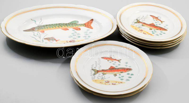 Cmielow Manufaktúra, hal mintás tálaló készlet 6 + 1 db. Kézzel festett, jelzett, apró kopással. Nagy tál 40x27 cm