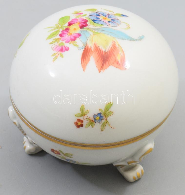 Herendi virág mintás bonbonniere, Kézzel festett. jelzett, lábán tűzrepedéssel 7,5 cm