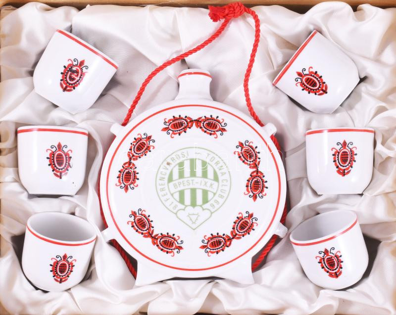 Hollóházi Ferencváros címeres palackkal italos szett, dobozában.