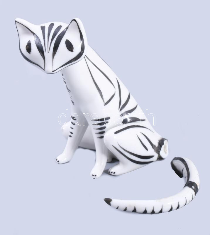 Hollóházi art deco macska. Terv.: Torma Istvánné, kézzel festett, jelzett, farka letört, m: 8,5 cm