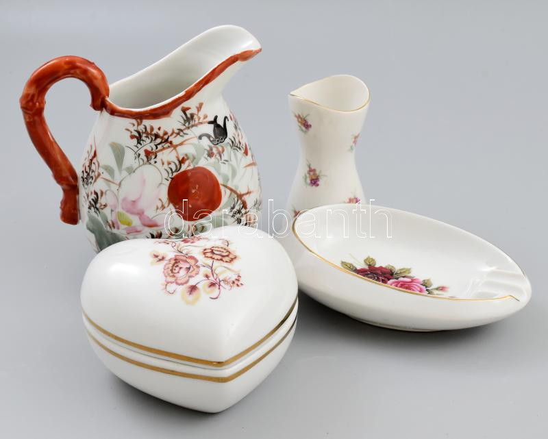 Hollóházi hamuzó + Aquincum kisváza + szív bonbonier + jelzetlen kínai kiöntő, kis kopással