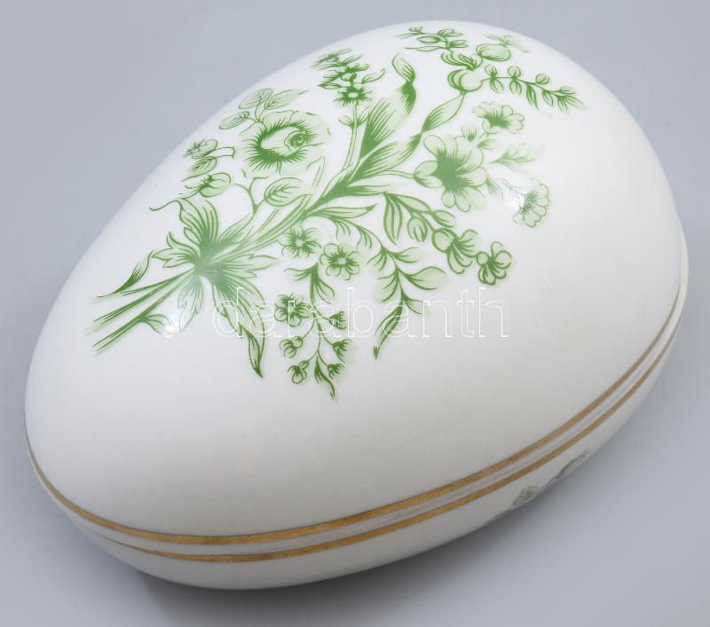 Hollóházi zöld virágmintás tojás alakú bonbonier, jelzett, h: 14,5 cm