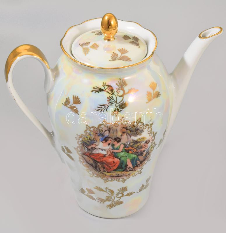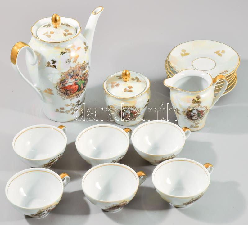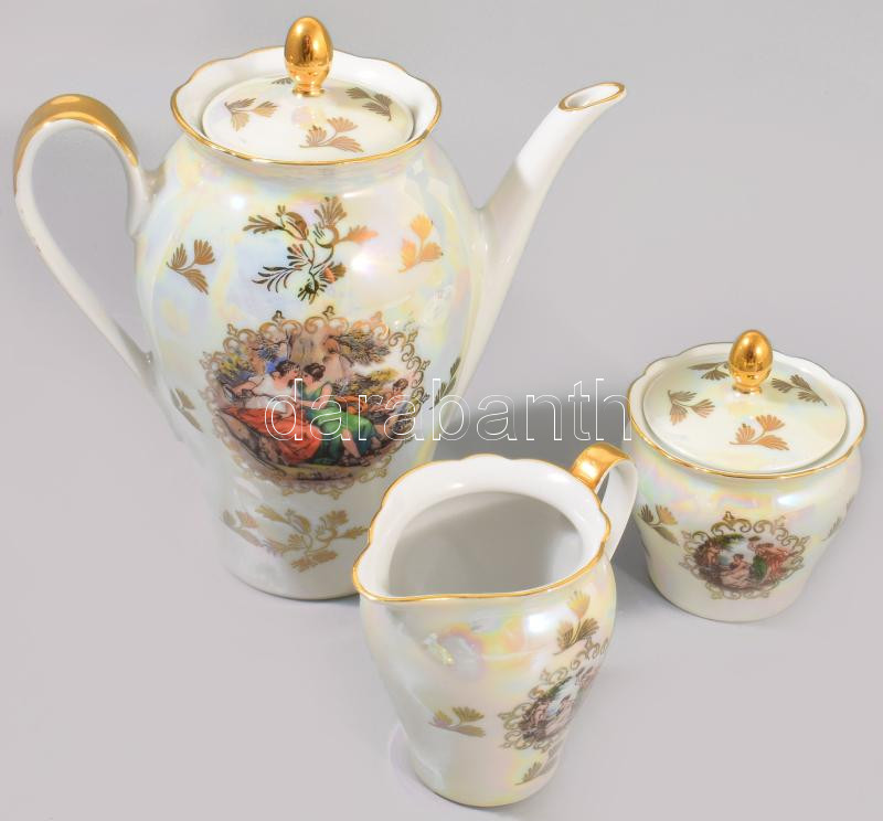 Kahla 6 személyes historizáló mintás kávés készlet, irizáló dekorral. Jelzett, teljes, egy fedél belsején kopással.