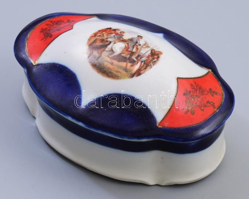 Katonai jelenetet ábrázoló porcelán dobozka. részben kézzel festett jelzett, kis kopással 13x9 cm