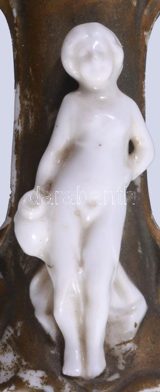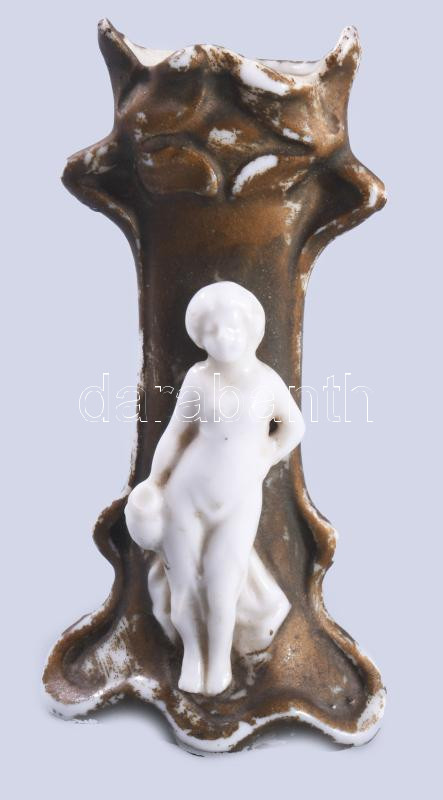Szecessziós nőalakkal díszített kisváza, kopással, m: 9 cm