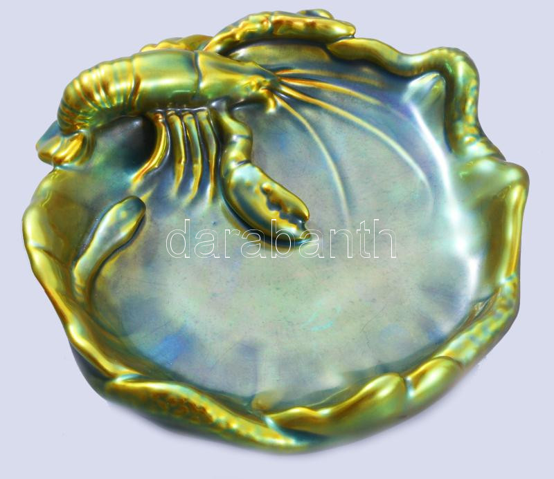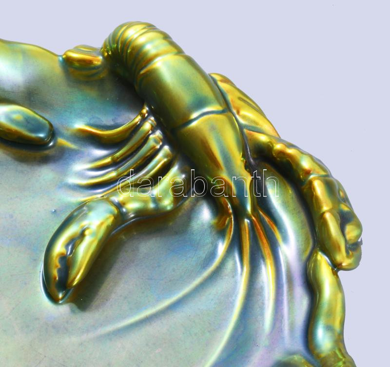 Zsolnay eozin mázas névjegykártyatartó, rákkal küzdő kígyó alakjával, jelzett, hibátlan, d: 18,5 cm