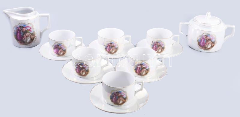 Zsolnay lüszteres zsánermintás kávés készlet, kiöntő nélkül, jelzett, egyik csészén pattanással.