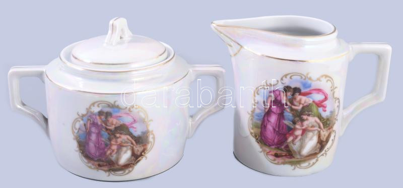 Zsolnay lüszteres zsánermintás kávés készlet, kiöntő nélkül, jelzett, ...