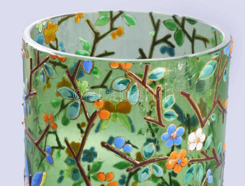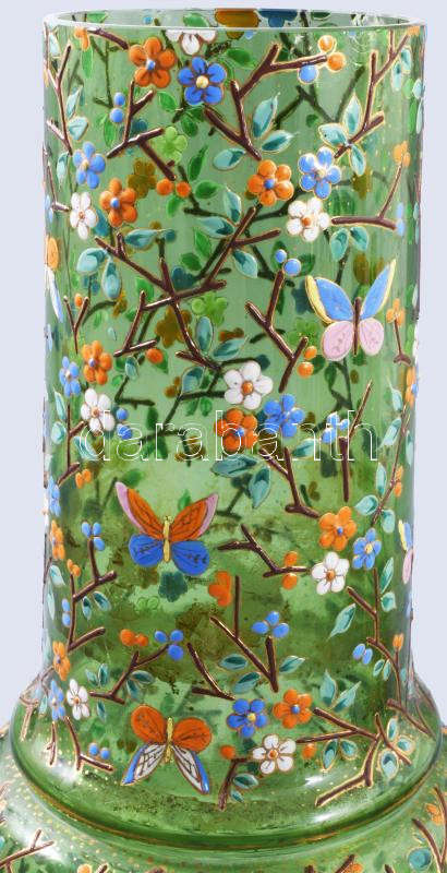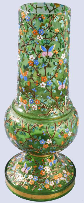 Hutaüveg váza, zománc festéssel, virágos és pillangós díszítéssel. Moyser? XIX. sz. Kézzel festett, szájánál kis lepattanással. 28 cm