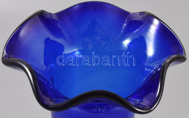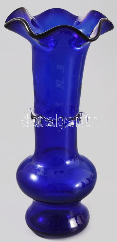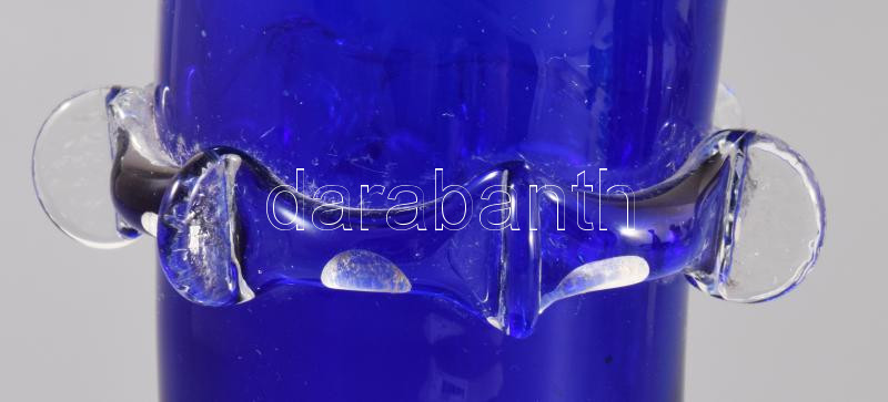 Királykék hutaüveg váza, üvegszál rárakással, hibátlan, m: 24,5 cm