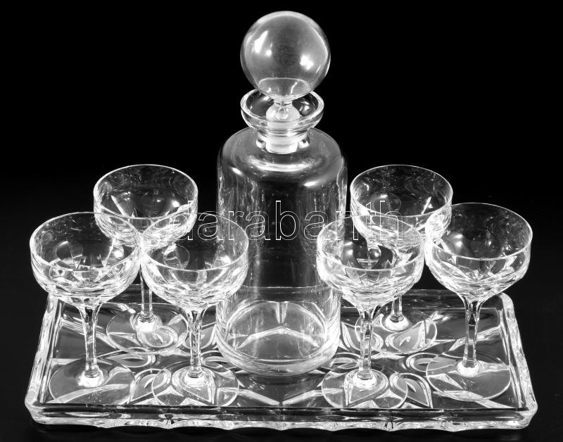Kristály 6 személyes italos készlet, jelzés nélkül, 6 darab pohár, dugós üveg, tálca, hibátlan, h: 34 cm, m: 27 cm