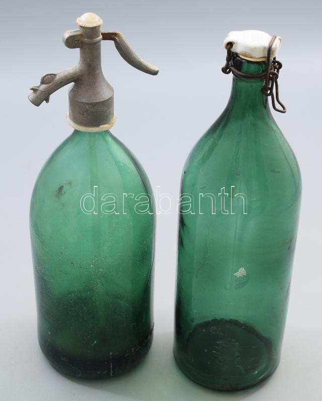 Retzro zöld román szódás üveg + csatos üveg, kopással, m: 33 cm