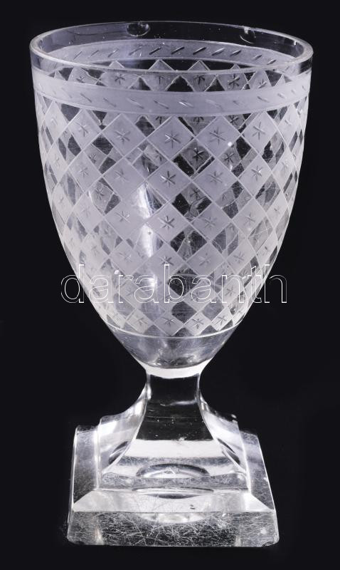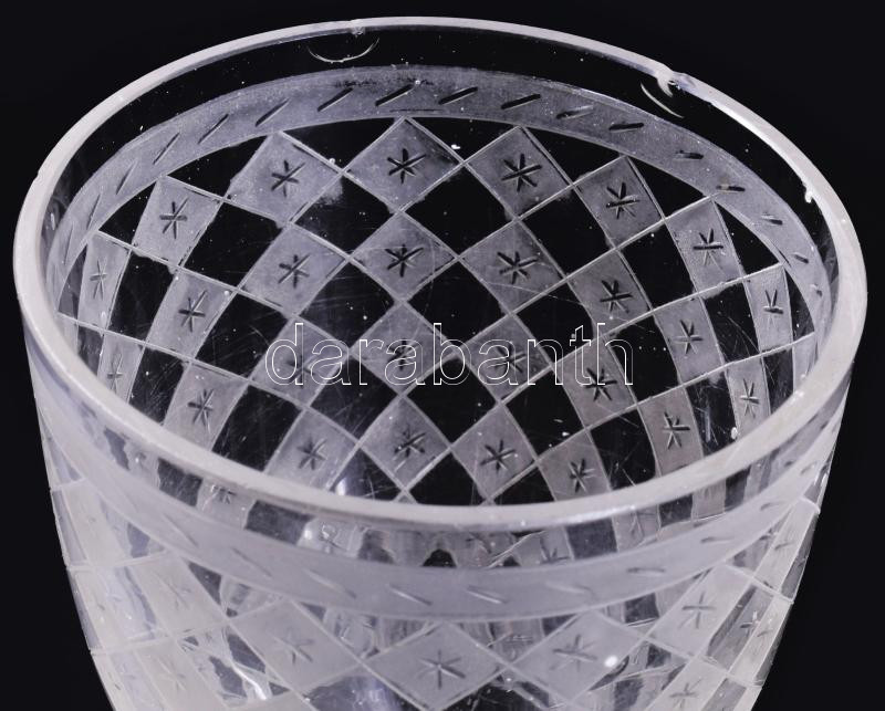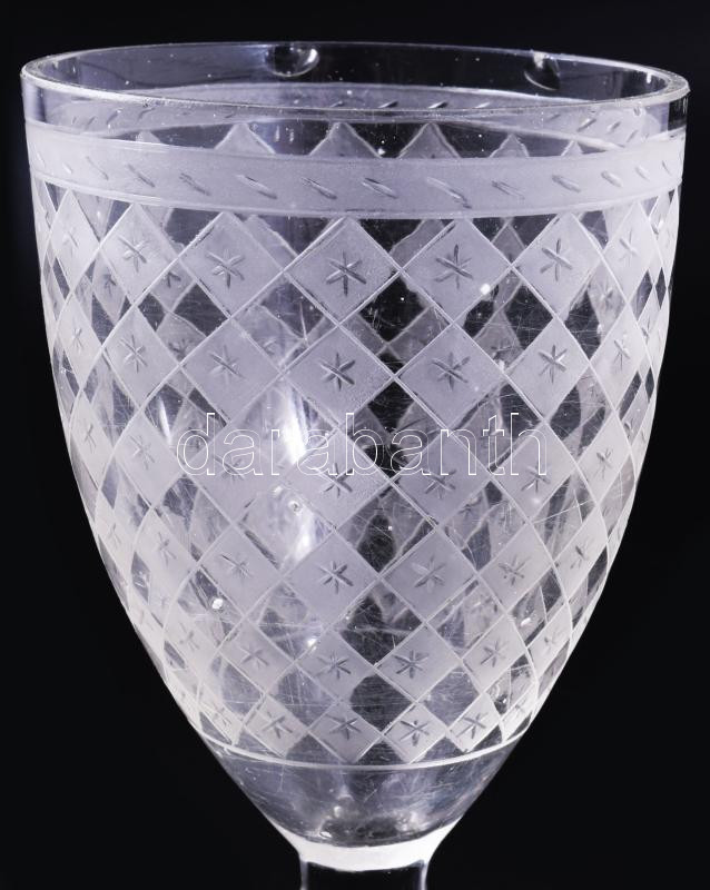 Description: cca 1880-1910 Kosta Boda "Odelberg" talpas pohár. Kézzel csiszolt hutaüveg, jelzés nélkül, lepattanással, m: 12,5 cm /// c. 1880?1910 Kosta Boda ?Odelberg? stemmed glass. Hand-cut furnace glass, unmarked, with a small chip, height: 12.5 cm.
