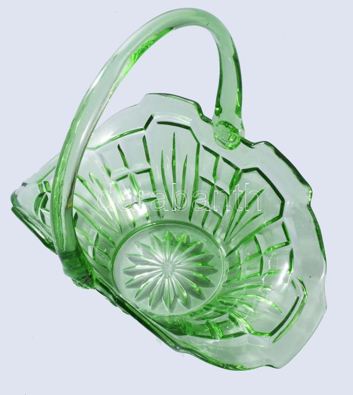 cca 1930/40 Zölden színezett üveg kínálókosár, hibátlan, 30x27 cm