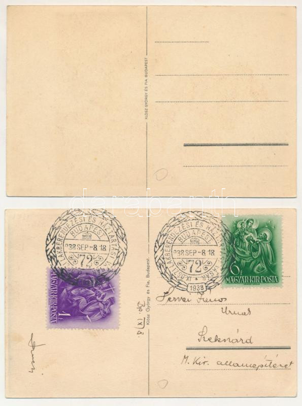 Description: 2 db RÉGI magyar reklám grafikai képeslap: 'A magyar szőlőnek nincsen párja' és 'Kedves egészségére', alkalmi bélyegzéssel / 2 pre-1945 Hungarian advertisement cards, with So. Stpl.