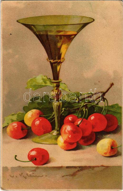 1913 Still life art postcard with cherry. Meissner & Buch Künstler-Postkarten Serie 1610. "Tafelfreuden" litho s: C. Klein (EK)
