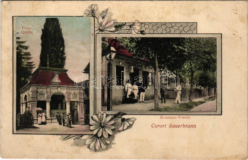 1916 Savanyúkút, Sauerbrunn; Forrás, üzlet, gyógyfürdő / Paul-Quelle, Konsum-Verein, Curort / spa, mineral spring source, shop. Art Nouveau, floral (ázott / wet damage)