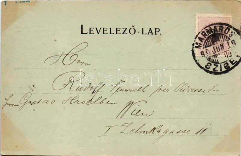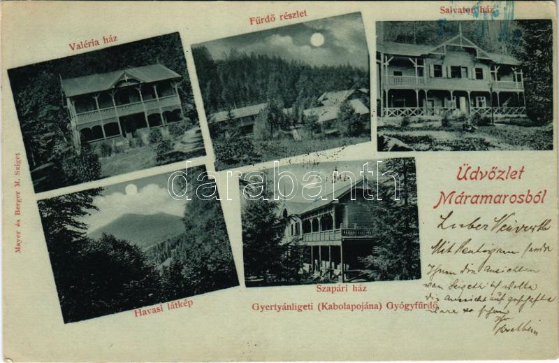 1899 (Vorläufer) Gyertyánliget, Polyana-Gyertyánliget, Kabola Polyána, Kobyletska Poliana (Máramaros, Maramures); Valéria, Szapári és Salvator ház, fürdő, havasi látkép, este. Mayer és Berger kiadása / villas, spa, night (EK)