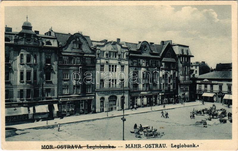 Ostrava, Moravská Ostrava, Mährisch Ostrau; Legiobank / bank, market, pharmacy, shops of Sonnegger, Guttmann (EK)